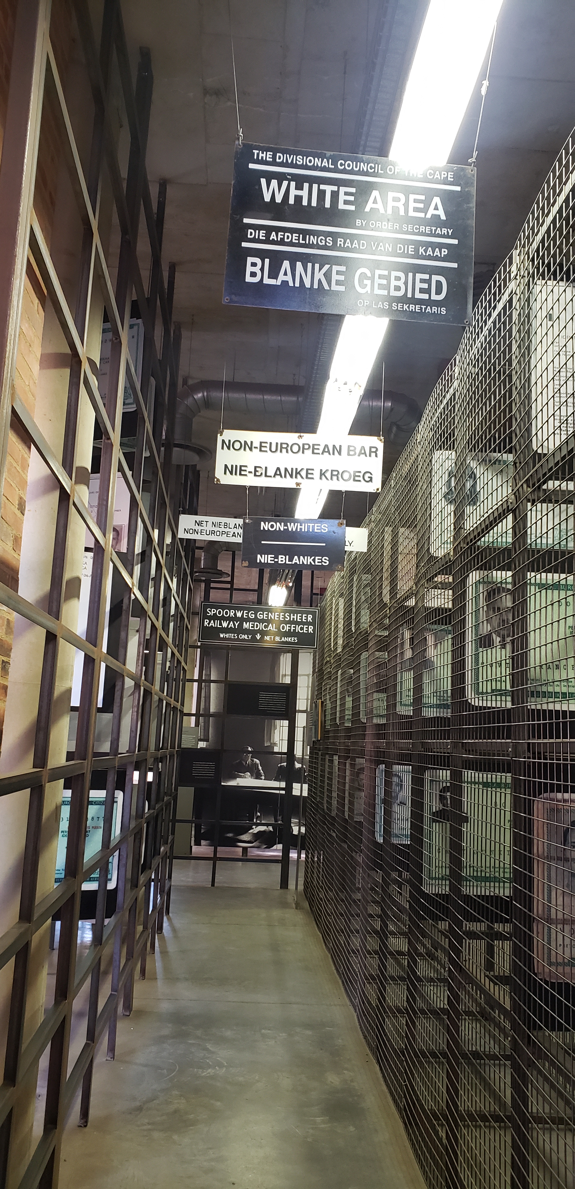 Conversely, the Apartheid Museum documents the systemic subjugation of non-white South Africans. The focus is not on the trek but the lives of the marginalized and the ways the governmental system made it permissive. From entering the museum through racialized door labels, to viewing the various forms of identification cards, and the ways dark bodies were cataloged and codified, the racial animus and oppression directed towards non-white South Africans is evident.