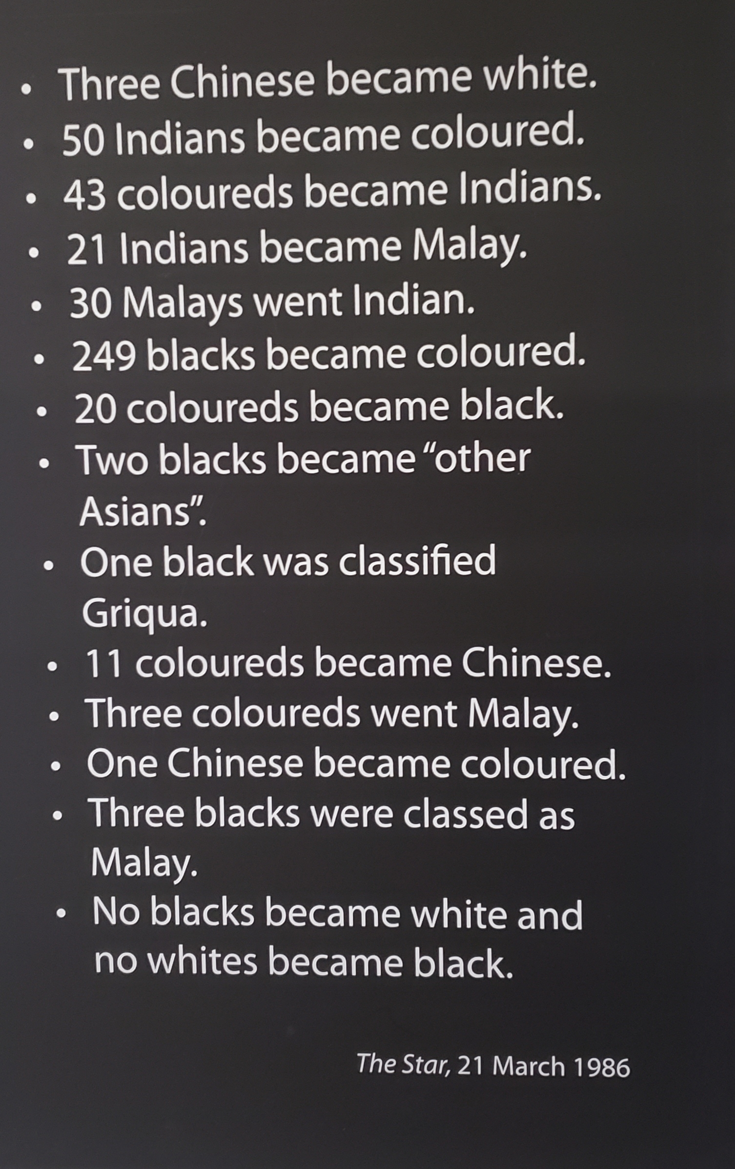 The above governmental racial cataloging of South Africans demonstrate migration across racial lines with clear delineation that Black can never become White and vice versa. – Apartheid Museum